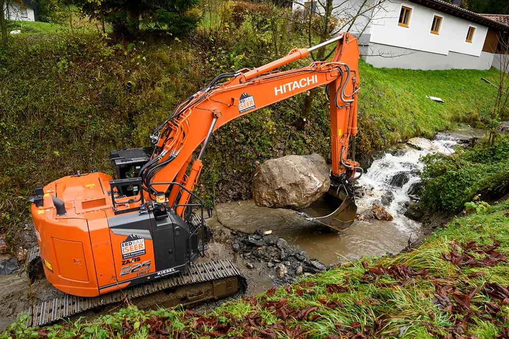 Bei der Erweiterung eines Flussbetts in Österreich werden die Vorteile der Rototilt Systeme für die Zielgruppe sichtbar gemacht.