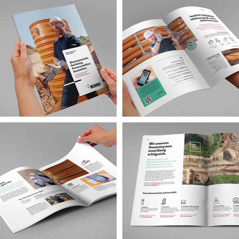 Um die Systemlösungen von REHAU im Bereich Tiefbau umfassend zu präsentieren, erarbeitete Lingner Marketing die Broschüre „Abwassertechnik. Nachhaltig. Partnerschaftlich. Ganzheitlich.“. Auf 16 Seiten werden, umrahmt von einer stimmigen Bildwelt aus dem Baustellenalltag, die Systeme, Vorteile und Services anschaulich dargestellt. Den Entscheidern wird dabei die ganzheitliche REHAU Lösungskompetenz in ansprechender Art und Weise vermittelt. Einen Eindruck können sich Interessierte hier verschaffen.