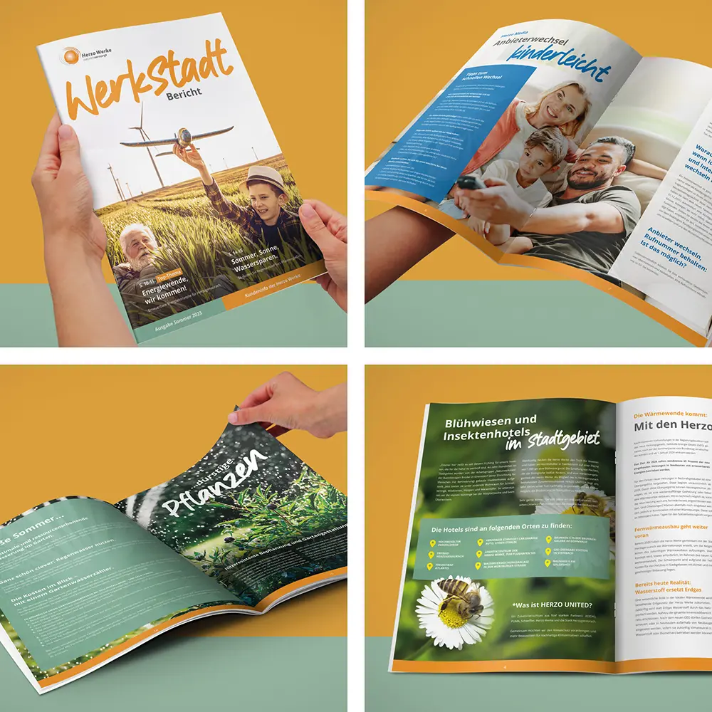 Für die Kundenzeitschrift „Werkstadt Bericht“ des Energieversorgers Herzo Werke kreierte Lingner Marketing einen neuen Look. Dabei lag das Augenmerk besonders auf der Leserfreundlichkeit. Mit klaren Strukturen und einer übersichtlichen Gliederung lassen sich nun noch einfacher spannende Beiträge rund um Energie, Nachhaltigkeit und Innovation finden. Zwar präsentiert sich das Kundenmagazin umfangreicher als zuvor, bleibt aber dank dem ansprechenden Designkonzept stets gut lesbar. Die gelungene Kombination von Text und Bild schaffen eine visuelle Harmonie, die die Leserinnen und Leser durch das gesamte Heft begleitet.