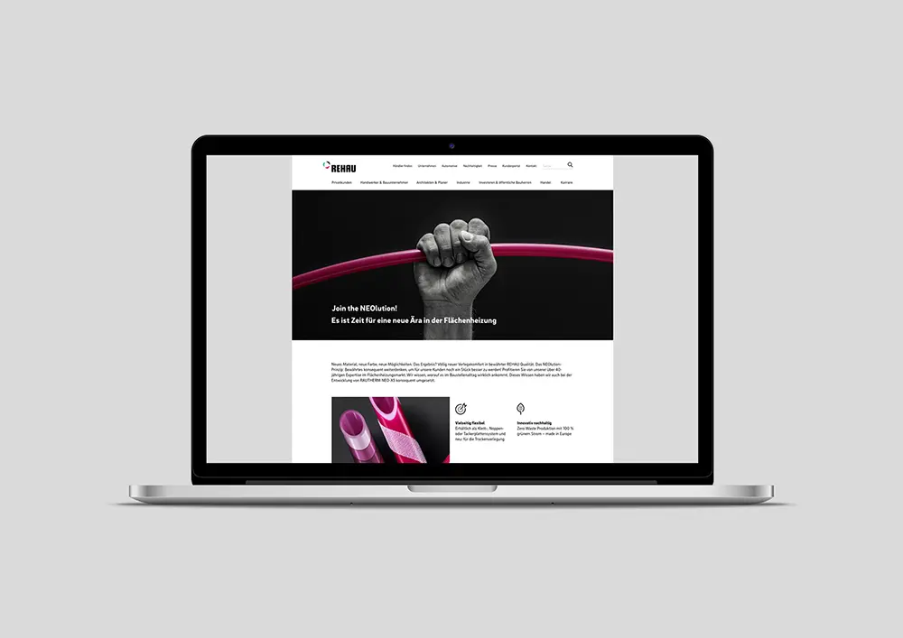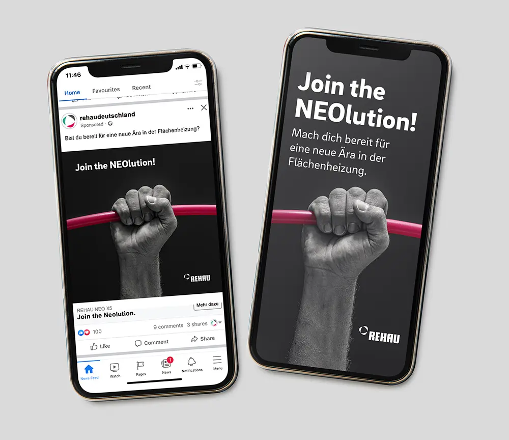 Die Agentur entwickelte den übergreifenden Claim „Join the NEOlution“, der sich vom Produktnamen ableitet und sich konsequent als Handlungsaufforderung durch alle Maßnahmen zieht. Ein ebenso starkes Key-Visual – eine in schwarz-weiß dargestellte Hand mit dem roten Rohr in einer kraftvollen Pose – sorgt für hohe Aufmerksamkeit und Wiedererkennung. Insgesamt nehmen sich die Bildwelten farblich stark zurück, sodass das neue rote Rohr mit seinem mehrschichtigen Aufbau klar im Fokus steht.