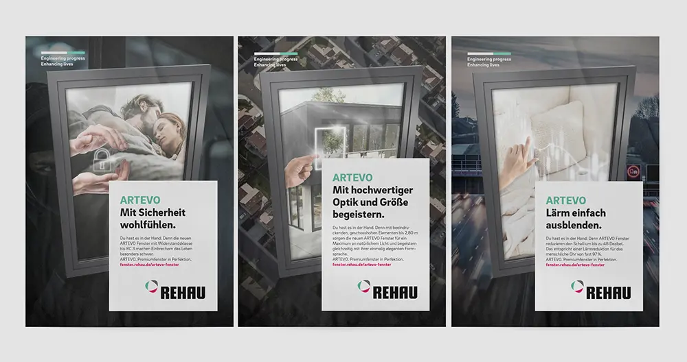 Für die Key-Visuals griff die Agentur eine bereits bestehende Idee von REHAU auf, entwickelte sie weiter und ließ jeweils zwei Lebenswelten stimmungsvoll aufeinanderprallen. So sieht man beispielsweise eine kalte, verschneite Winterlandschaft, die durch ARTEVO betrachtet, zur Wohlfühlatmosphäre wird. Oder eine stark befahrene Straße, die durch ARTEVO betrachtet, im Gebäude überhaupt keine Rolle mehr spielt. Dabei zeigt die stets in den Motiven wiederkehrende Hand, dass es die Bewohner mit ARTEVO selbst in der Hand haben, zwischen beiden Lebenswelten zu wählen. Auf diese Weise werden die Vorteile des Premiumsystems optisch perfekt in Szene gesetzt und benötigen dabei wenig Erklärung.