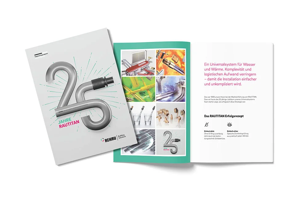 Eine visuelle Hommage an die Erfolgsgeschichte von RAUTITAN: Das aufmerksamkeitsstarke Key-Visual bildet eine große „25“ aus dem Rohrsystem und zieht sich durch alle Maßnahmen.