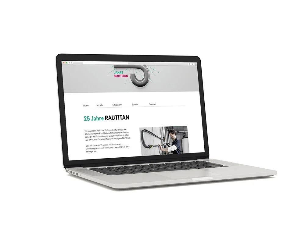 Die Kreativagentur entwickelte daraufhin eine Kampagne, die sowohl Online- als auch Offline-Maßnahmen vereint. Ihr Herzstück ist ein aufmerksamkeitsstarkes Key-Visual, welches eine große „25“ aus dem Rohrsystem formt und dabei die Originalfarben beibehält – eine visuelle Hommage an die Erfolgsgeschichte von RAUTITAN. Das Motiv zieht sich als roter Faden durch alle Maßnahmen und sorgt für eine hohe Wiedererkennung über sämtliche Kanäle hinweg.