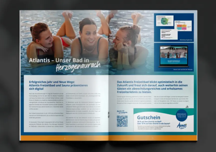 Seit dem Pitch Gewinn 2023 sind wir die neue Lead Agentur der Herzowerke aus Herzogenaurach und beraten den Ener-gieversorger im Bereich Strategie und Marketing. Nach einem erfolgreichen Markenworkshop in welchem u.a. die verschiede-nen Subbrands wie Herzo Media und Herzo Bäder strukturiert wurden, entwickelten wir ein neues Look & Feel, welches wir nach und nach auf die verschiedenen Unternehmensbereiche anwenden. Neben vielen Print-Maßnahmen wie Anzeigen, Geschäftsberichten und der Kundenzeitung „WerkStadtBericht“, für welche wir auch mit dem German Design Award 2024 ausgezeichnet wurden, haben wir für das Erlebnisbad Atlantis bereits einen neuen Website Relaunch umgesetzt. Weitere Websites werden folgen.